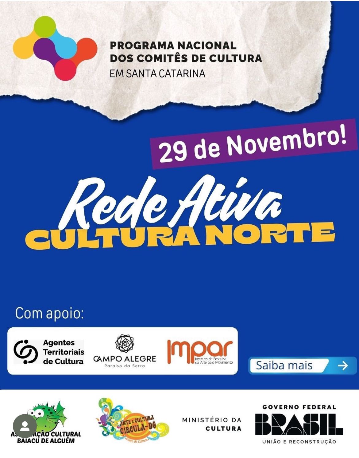 A Rede Ativa Cultura Norte convida artistas, produtores e agentes culturais dos territórios de São Bento do Sul, Campo Alegre e Rio Negrinho para um encontro de formação, mobilização e vivência artística no dia 29 de novembro de 2025. A atividade será realizada no Espaço Cultural Profa. Sirley Maria Neumann Johanson, das 13h30 às 19h,… Continue a ler »Rede Ativa Cultura Norte promove encontro de formação e mobilização em Campo Alegre