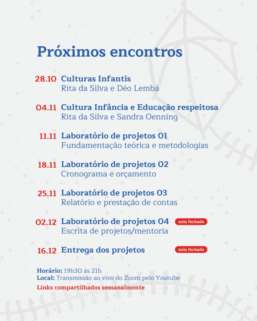 Os encontros acontecerão sempre às terças-feiras, das 19h30 às 21h, com aulas realizadas na plataforma Zoom e transmissão ao vivo pelo YouTube da Usina da Imaginação. A proposta é ampliar o acesso aos conteúdos formativos, promovendo o diálogo e a articulação entre diferentes iniciativas culturais voltadas às infâncias no estado.