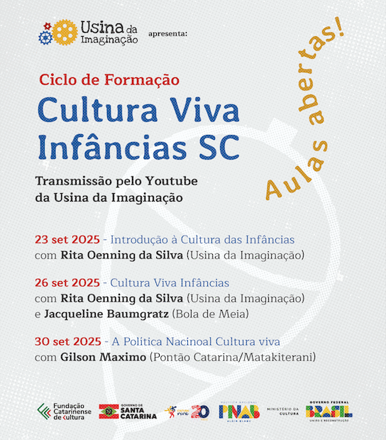 Formação cultura infâncias aberta ao público em setembro! O Pontão Usina da Imaginação, por meio do projeto Cultura Infâncias, vai realizar de três eventos abertos e gratuitos em setembro dentro da programação do Ciclo de Formação Cultura Viva Infâncias SC, nos dias 23, 26 e 30 de setembro, com transmissão ao vivo pelo YouTube. O Ciclo, que reúne 80 agentes… Continue a ler »Formação Cultura Infâncias