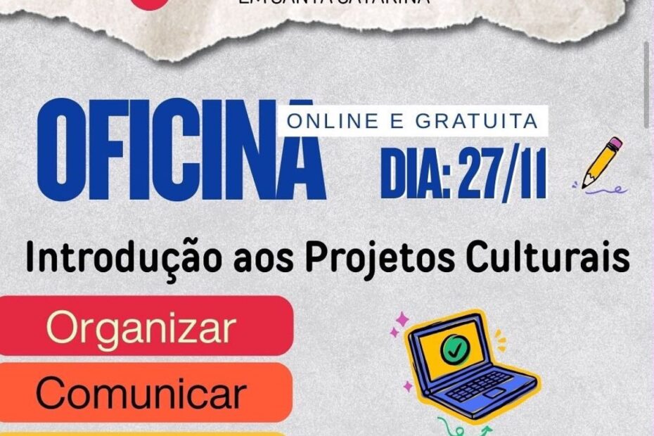Estão abertas as inscrições para a oficina Introdução aos Projetos Culturais, voltada a artistas, produtores, integrantes de coletivos e agentes culturais que estão iniciando o acesso às políticas públicas de cultura em Santa Catarina. A formação Organizar, Comunicar e Executar: Introdução aos Projetos Culturais apresenta, de forma prática e acessível, os principais passos para estruturar um projeto cultural do início… Continue a ler »Participe da Oficina de introdução aos Projetos Culturais